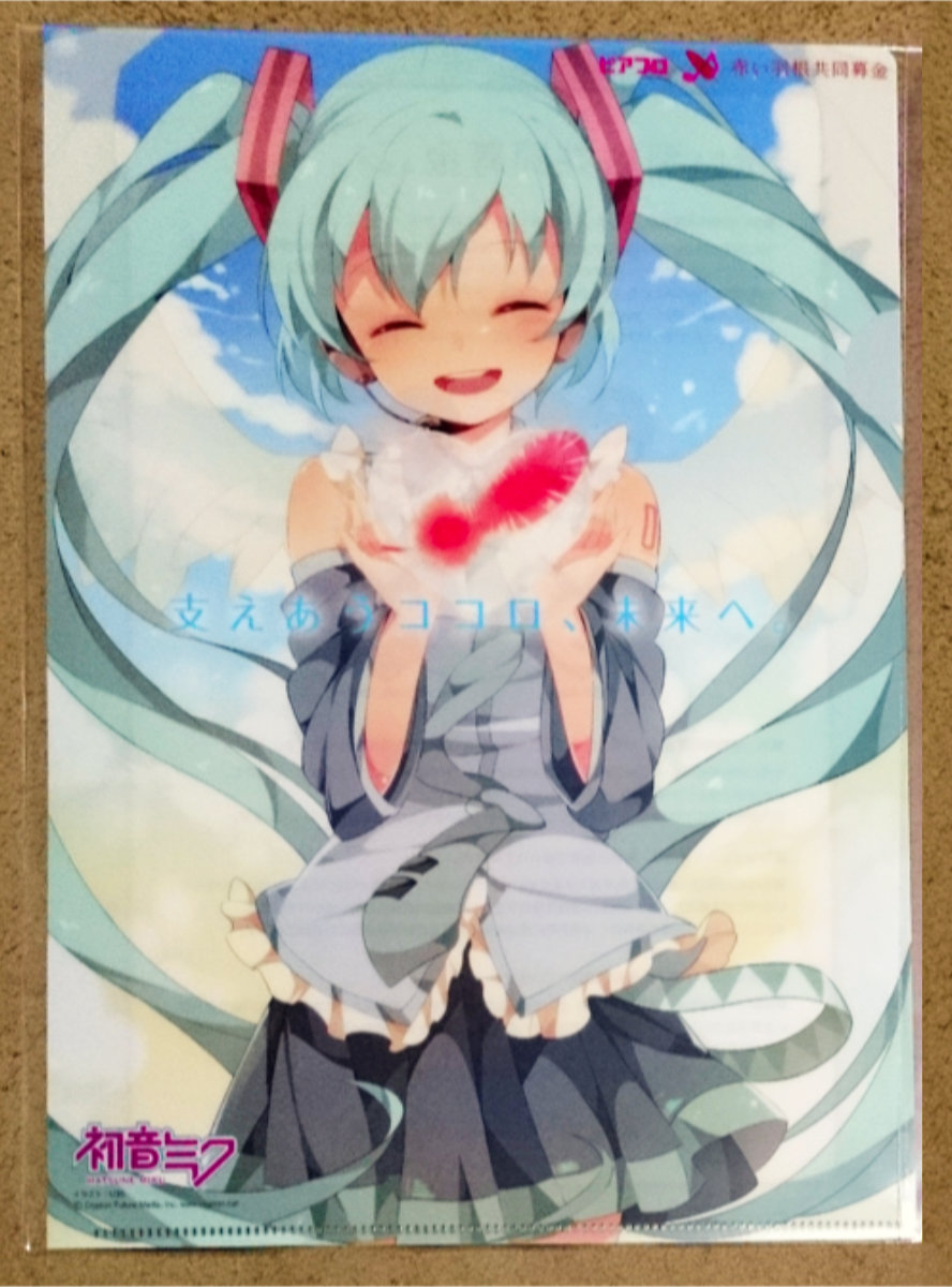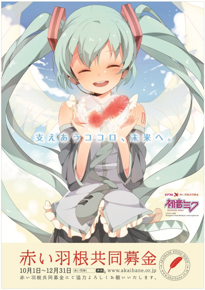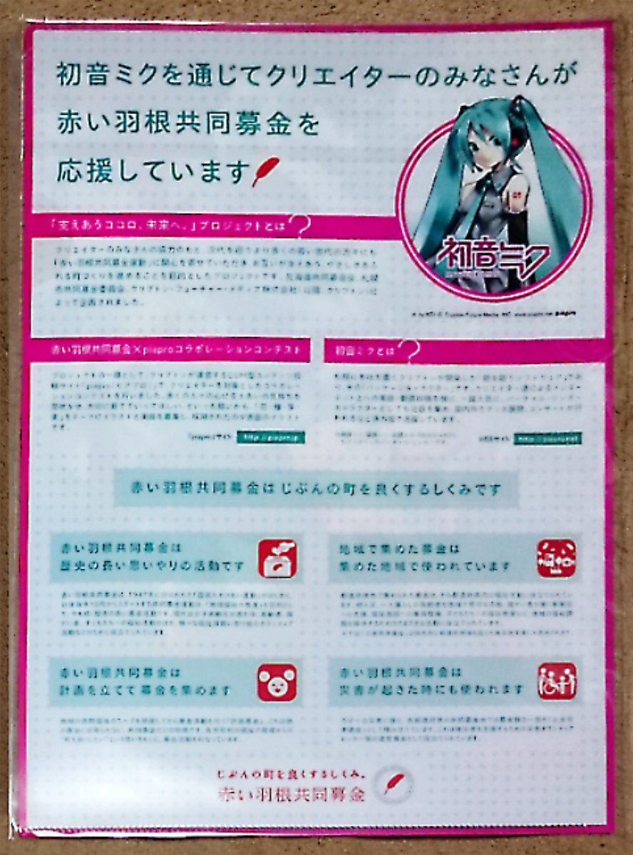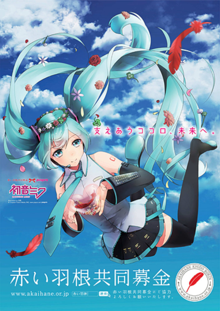 題材となった「 初音ミク 」は「クリプトン・フューチャー・メディア」社が出した音声合成ソフトのキャラクターです。大人気のキャラクターですが、初音ミクは様々な場面で起用に際してライセンスフィーを撮っていない場合が多く、おそらくこの赤い羽根の取り組みも同じだと思います。