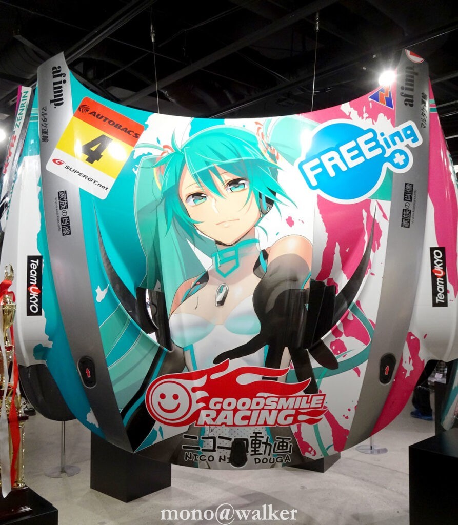 さて展示会場内はと言うと、GT選手権的なアイテム(パネル展示やトロフィーなど)も少なくないですが、印象としては初音ミク寄りの展示でした(レースのVTRなども流れていました)