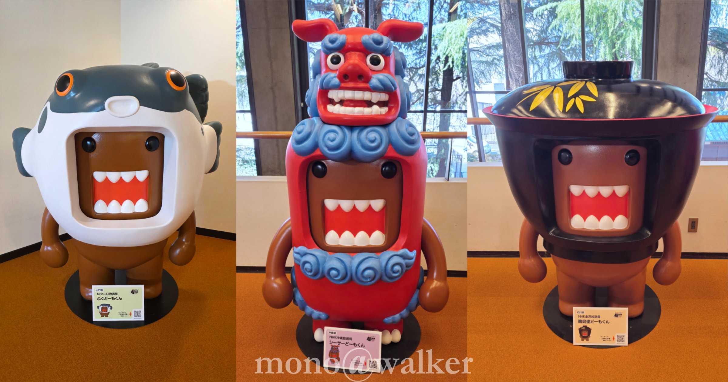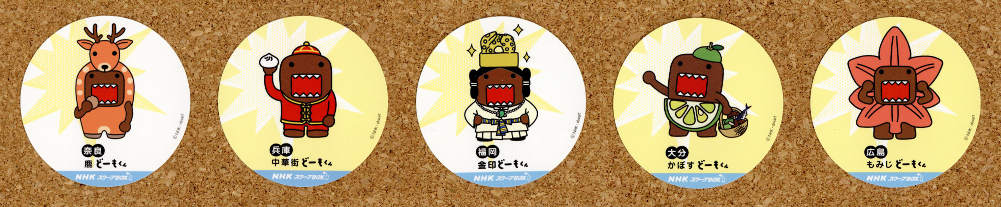 左から奈良 鹿どーもくん、兵庫 中華街どーもくん、福岡 金印どーもくん、大分かぼすどーもくん、広島 もみじどーもくんです。