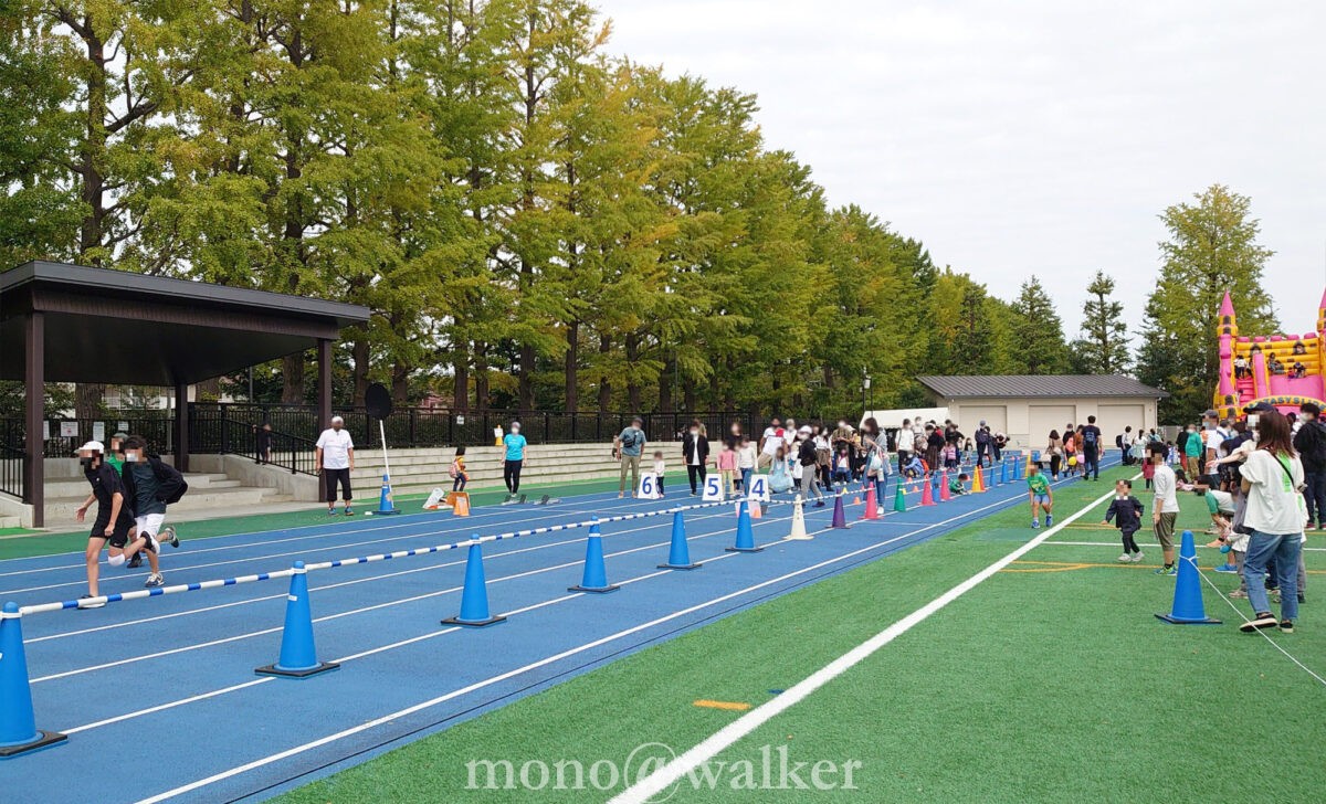 スペースはもちろん広いくていいのですが駅前から運動場まで600mくらいあって、混雑を考えると何往復もするのは大変なので1往復で回りきる作戦にします。